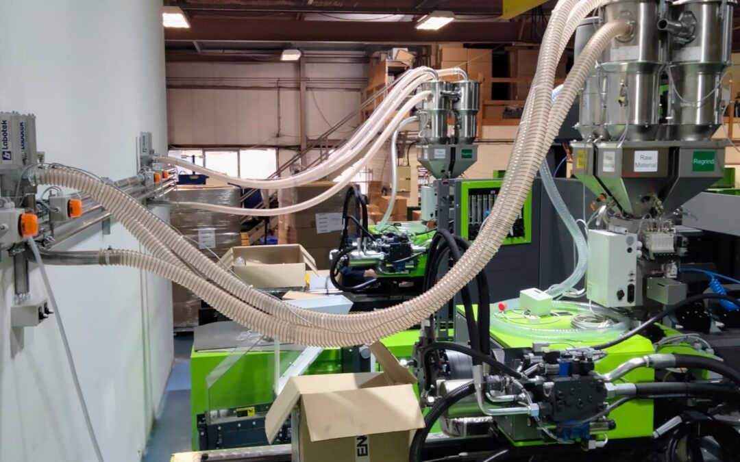 As part of a close loop system, RW Simon use Ferlin Gravimetric Blenders to reintroduce the regrind directly into the throat of the barrel. They also have a Labotek “Microscan” central feed system to feed the dosing units the regrind, virgin, and masterbatch materials. All of which is part of a £1.3m investment that also included 3 off Engel Victory 300 moulding machines.